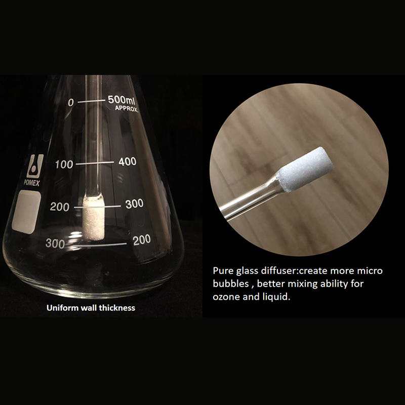 This kit is an upgrade version with pure glass material for the whole bottle which make sure the whole mixing process is clean and safe. It is an ideal solution for ozone water treatment, ozonated olive oil making, and insufflation therapy. Moreover, compare with diffuser stone, the glass diffuser can improve the gas-liquid mixing result, so there is more ozone can stay at the liquid.